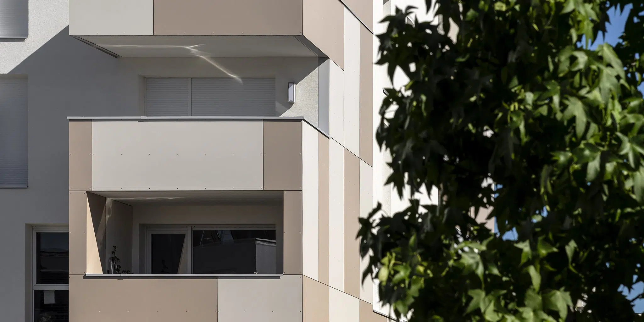 L’ensemble propose la réalisation de 53 logements du T2 au T4 (17 T2, 26 T3, 10 T4). Ils sont répartis sur deux bâtiments R+3 et R+4 liés en sous-sol par le socle commun des garages.
