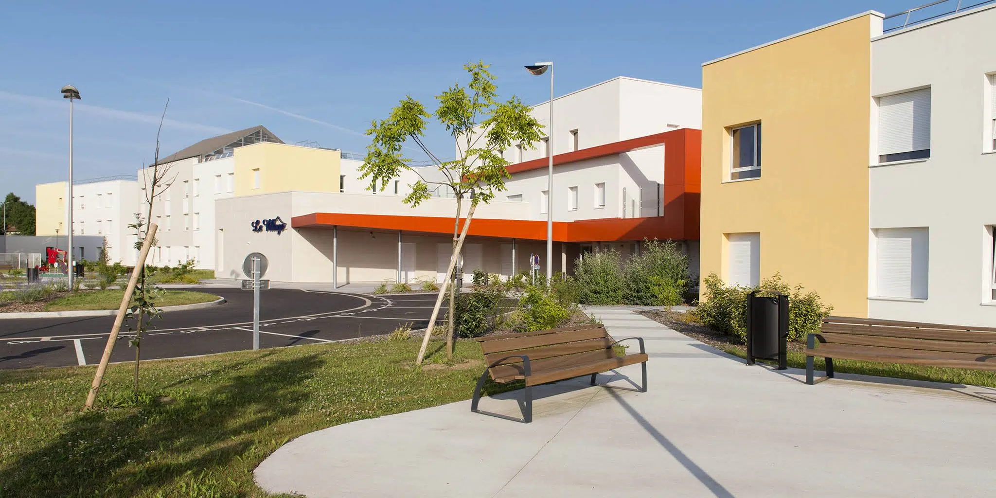 Les services sont organisés comme un village. Des lieux de vie entrecoupés de cheminements pietonniers, de jardins et de patios. Un principe qui évoque la vie domestique et propose des espaces à l’échelle humaine.