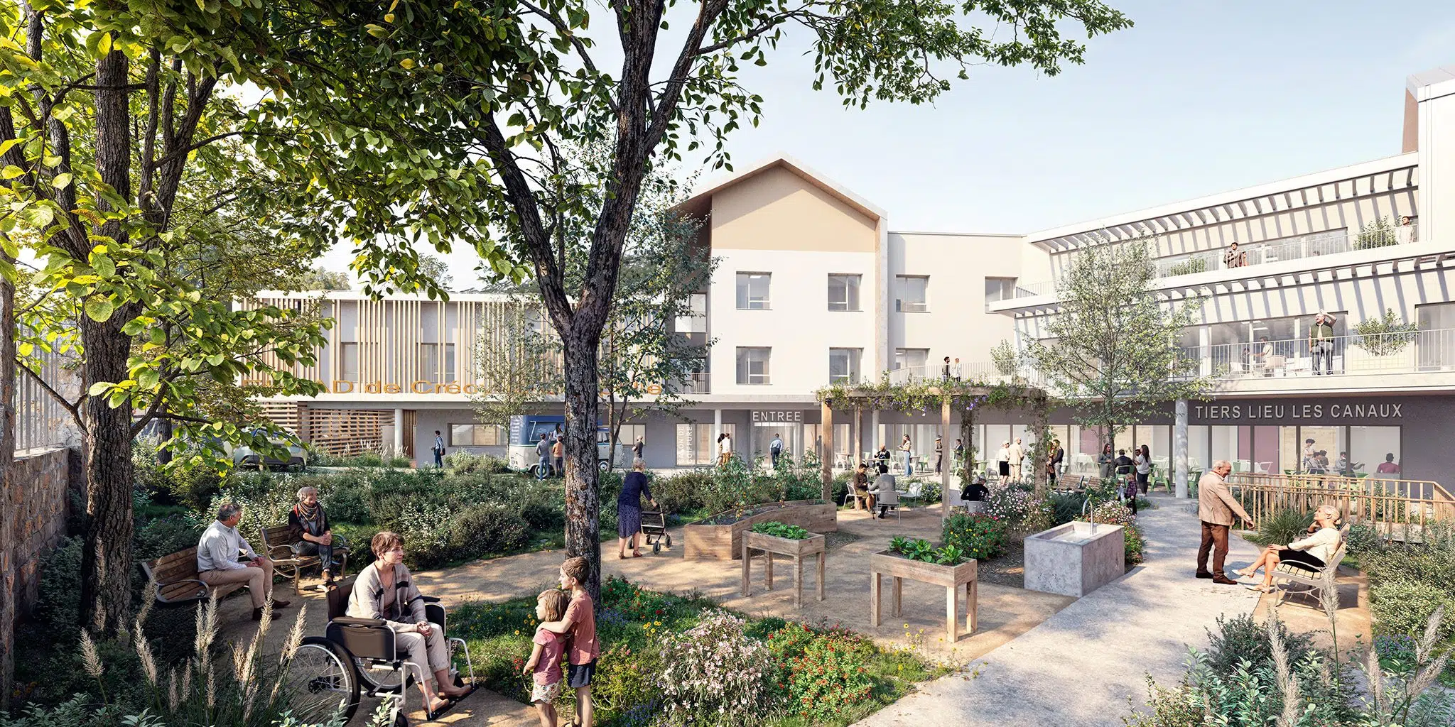 Agrémenté de nombreuses terrasses et de jardins paysagers, le projet offre un équilibre entre un bâtiment institutionnel et un lieu de vie dont l’esthétique de la maisonnée renvoie aux codes rassurants du domicile. Le parvis est à l’articulation entre la ville et la résidence, offrant un jardin ouvert sur l’extérieur avec un parc, un salon extérieur, un parcours thérapeutique, un jardin thérapeutique, une terrasse et un tiers lieu.
